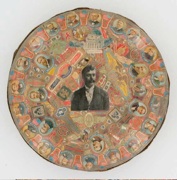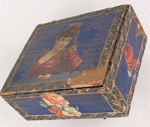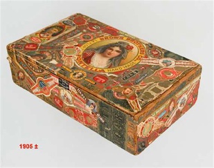 Cigar band decoupage was particularly popular 1900-1930. This colorfully done example dates around 1905.