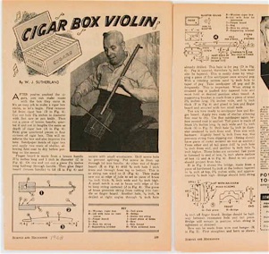 In the following thirty years years I located a few dozen guitars, violins, ukes and banjos, as well as a few less familiar creations. They had been made as toys, stage props, department store window decoration and as serious musical instruments, some made by very fine luthiers. I learned that instructions for making cigar box instruments appeared in men’s, women’s and boy’s magazines as early as the 1870’s. (the one illustrated is from Science and Mechanics, 1948) Popular in all generations from the Civil War to Vietnam, cigar box instruments are undergoing a revival of interest today. Bands made up wholly or in part by cigar box instruments now play gigs, record CD’s and highlight festivals. Instruments of all ages sell on eBay.