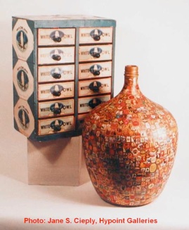 Well designed cigar box chest of drawers based on late 1930’s WHITE OWL boxes. Not part of our collection but displayed so visitors can see what an attractive cigar box drawer set looks like. Most are nowhere near this nice. Photo taken in 1999 by Jane S. Cieply of Hypoint American Antiques & Folk Art, Barrington, Illinois.