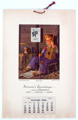 This 1946 Stuart calendar picturing a cigar box violinist was the personalized Christmas card of famous Russian concert violinist David Rubinoff whose autographed picture hangs on the boy’s wall.