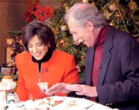 For three years on the CBS SATURDAY EARLY SHOW I was fortunate to work with Russ Mitchell & Thalia Assuras, two first rate pros who are now news anchors for CBS-TV. Here I show Thalia an exquisite selection of Christmas ornaments. Photo by Marilee 2000