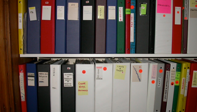 Two of eight shelves filled with photos, postcards, trade cards, envelopes, letters, catalogs, documents, bills, government publications, magazine articles, receipts, advertising and other paper ephemera related to cigars. Red dots indicate the contents have been photographed. I have taken 26,000 photos so far, and a long way to go.
