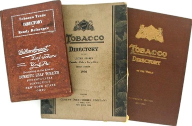 Directories are state-by-state, city-by-city, books listing cigar factories, tobacco factories and cigarette factories. These books were published since the 1860's. Usually hard cover except for around 1930. Can have as many as 600 pages.