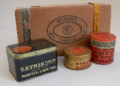 I buy fine condition boxes & cans from S. Hyman tobacco and cigar factory in Montreal, Canada. His products are clearly marked with his name. Any box or can other than those pictured is wanted if in fine condition. $50-$100 paid for most. [DN8828]